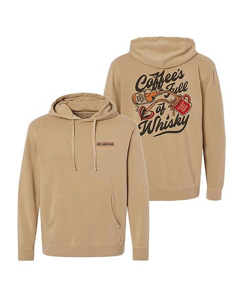“Coffee’s Full Of Whiskey” design on the back of a clay colored pullover hoodie and